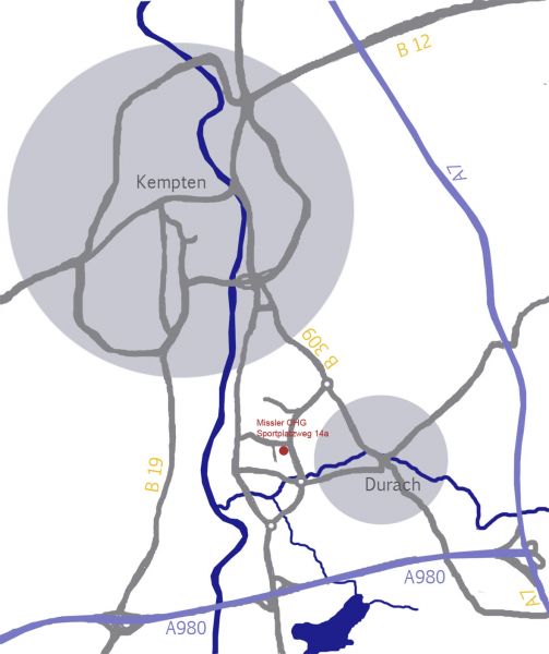 Am Berliner Platz links auf den Schumacherring, dem Ring folgen bis Abfahrt Durach/Füssen, der B309 folgen Richtung Durach bis Kreisverkehr, hier die erste Ausfahrt nehmen und der Umgehungsstaße folgen, die zweite Möglichkeit rechts abbiegen und gleich wieder links in den Hof